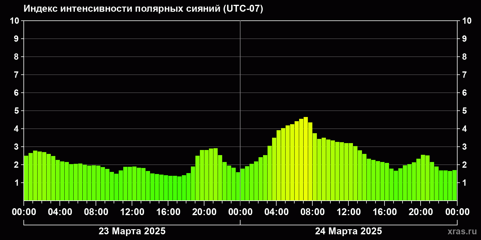 Изменения индекса интенсивности полярных сияний с 2025-03-23 по 2025-03-24 по местному времени