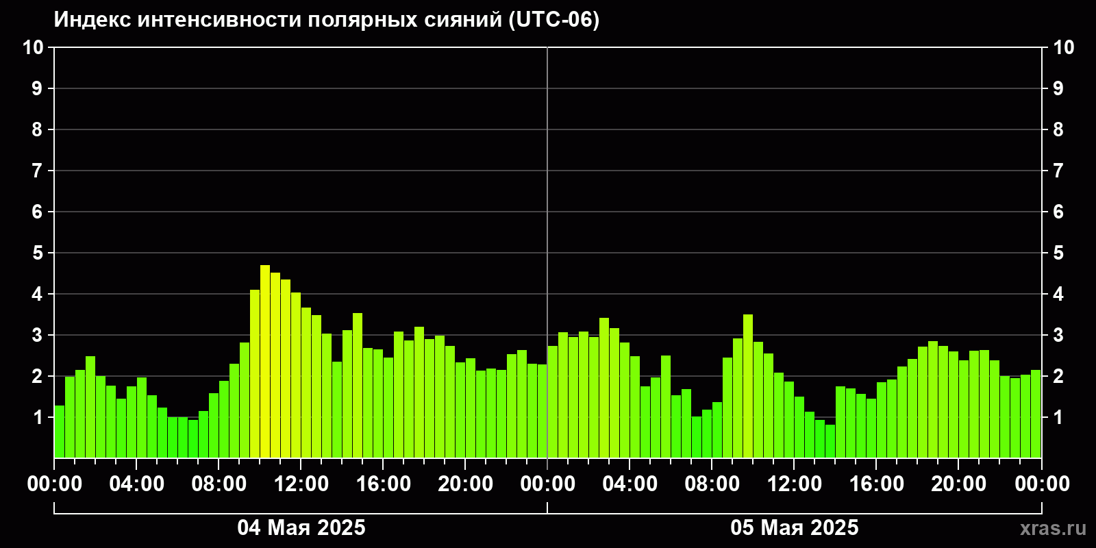 Изменения индекса интенсивности полярных сияний с 2025-05-04 по 2025-05-05 по местному времени