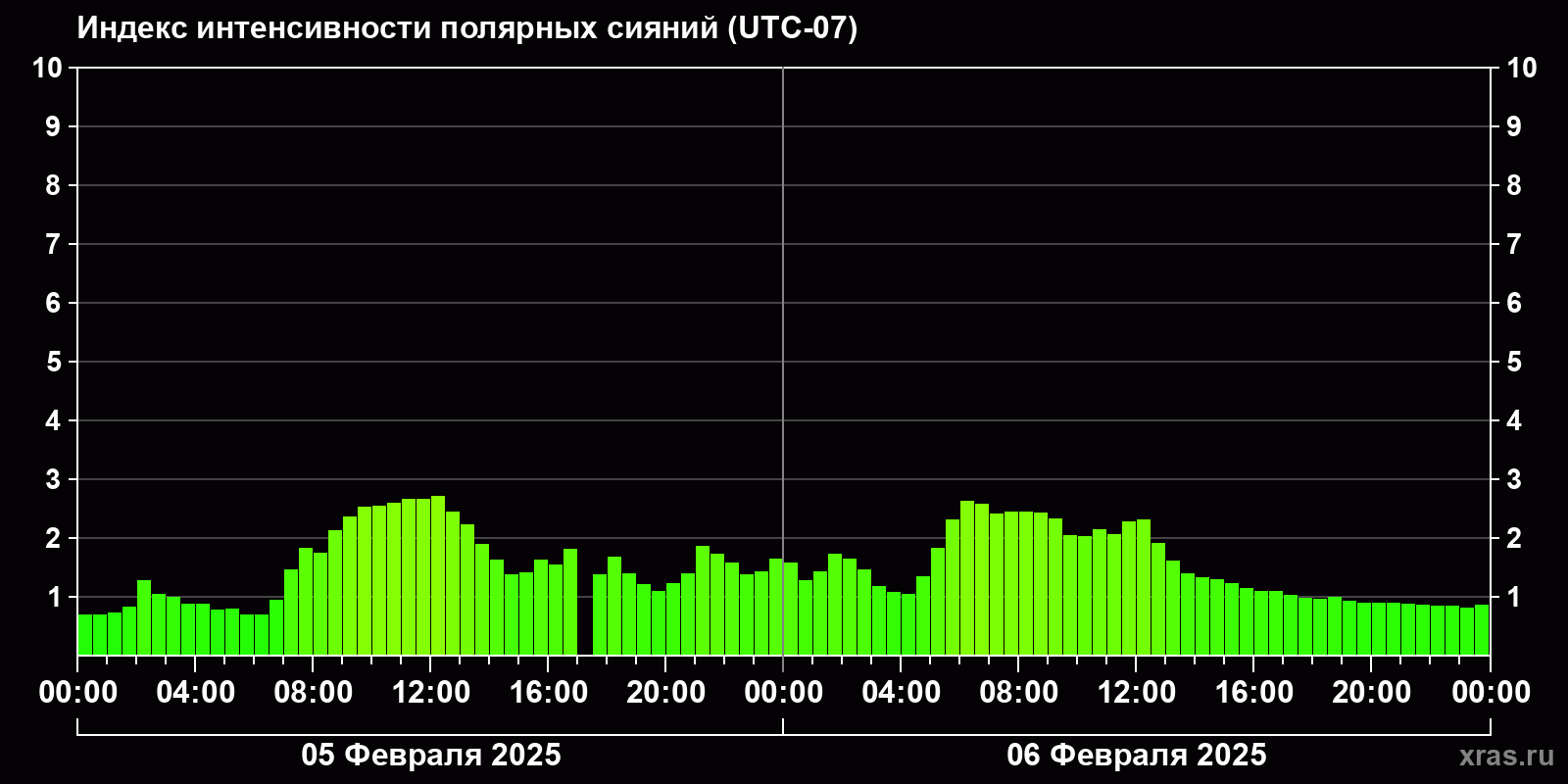 Изменения индекса интенсивности полярных сияний с 2025-02-05 по 2025-02-06 по местному времени