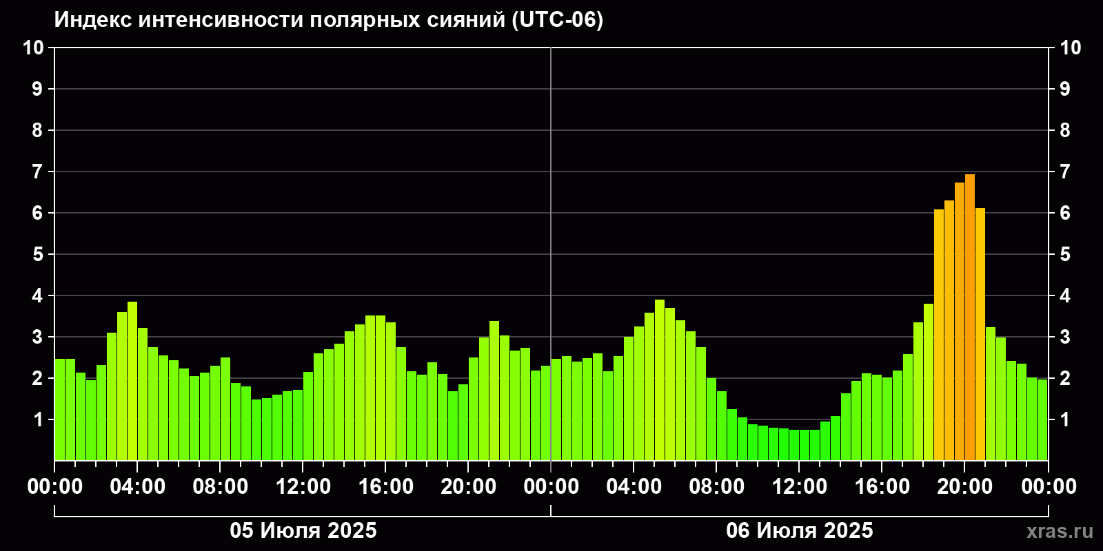 Изменения индекса интенсивности полярных сияний с 2025-07-05 по 2025-07-06 по местному времени