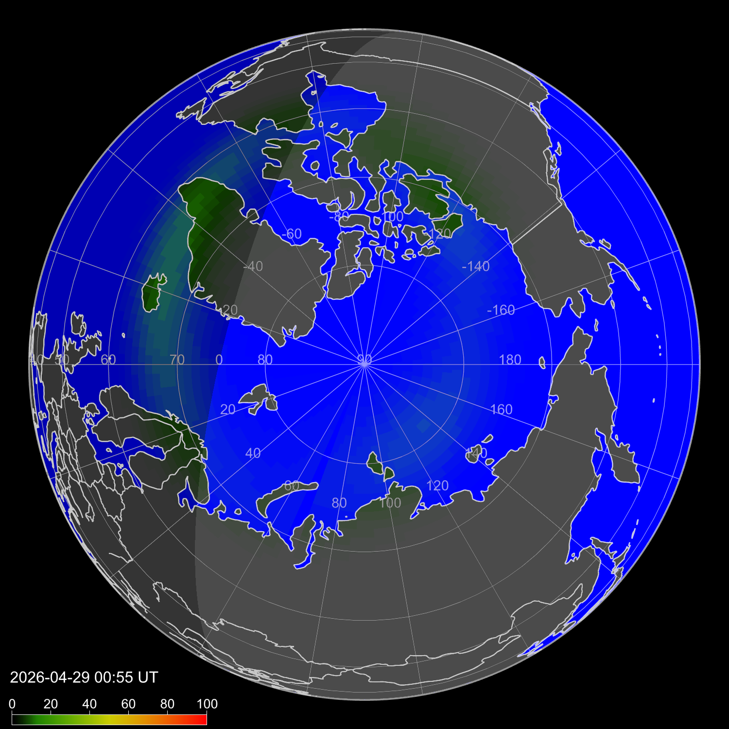 Изменения и часовой прогноз индекса интенсивности полярных сияний с 2026-04-28 по 2026-04-29