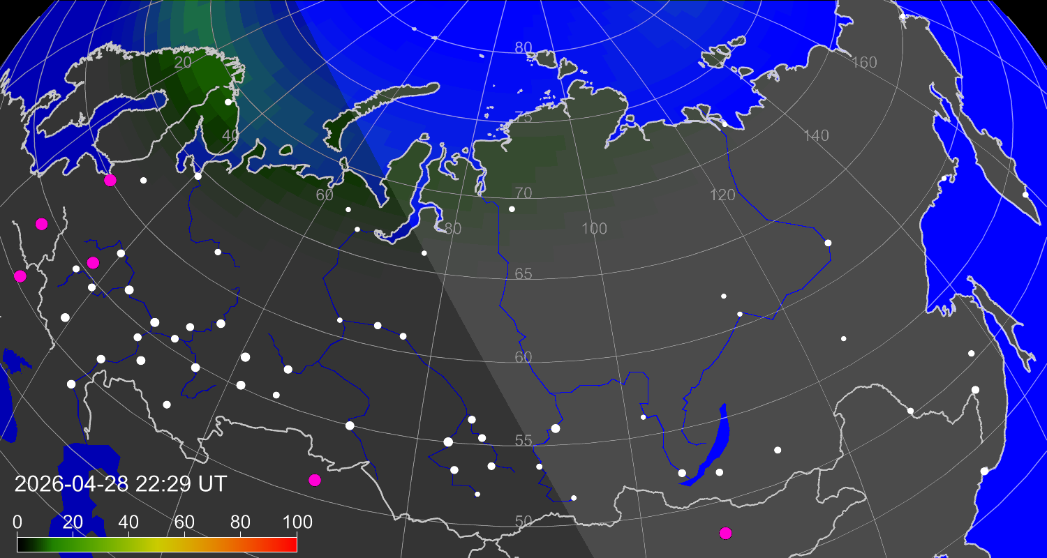 Индекс интенсивности полярных сияний и теоретически возможная широта наблюдений для ночного времени в восточном полушарии