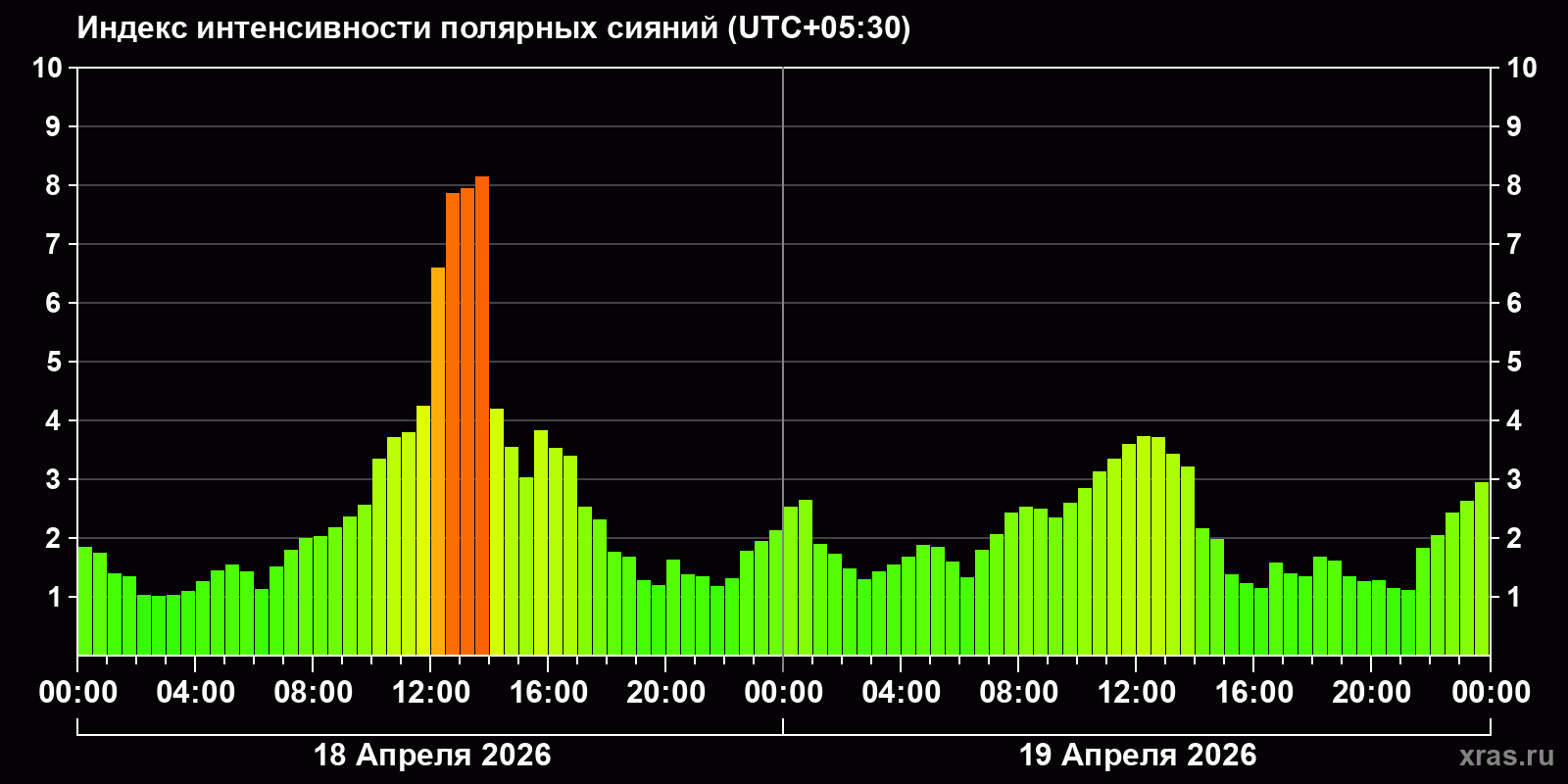 Изменения индекса интенсивности полярных сияний с 2026-04-18 по 2026-04-19 по местному времени