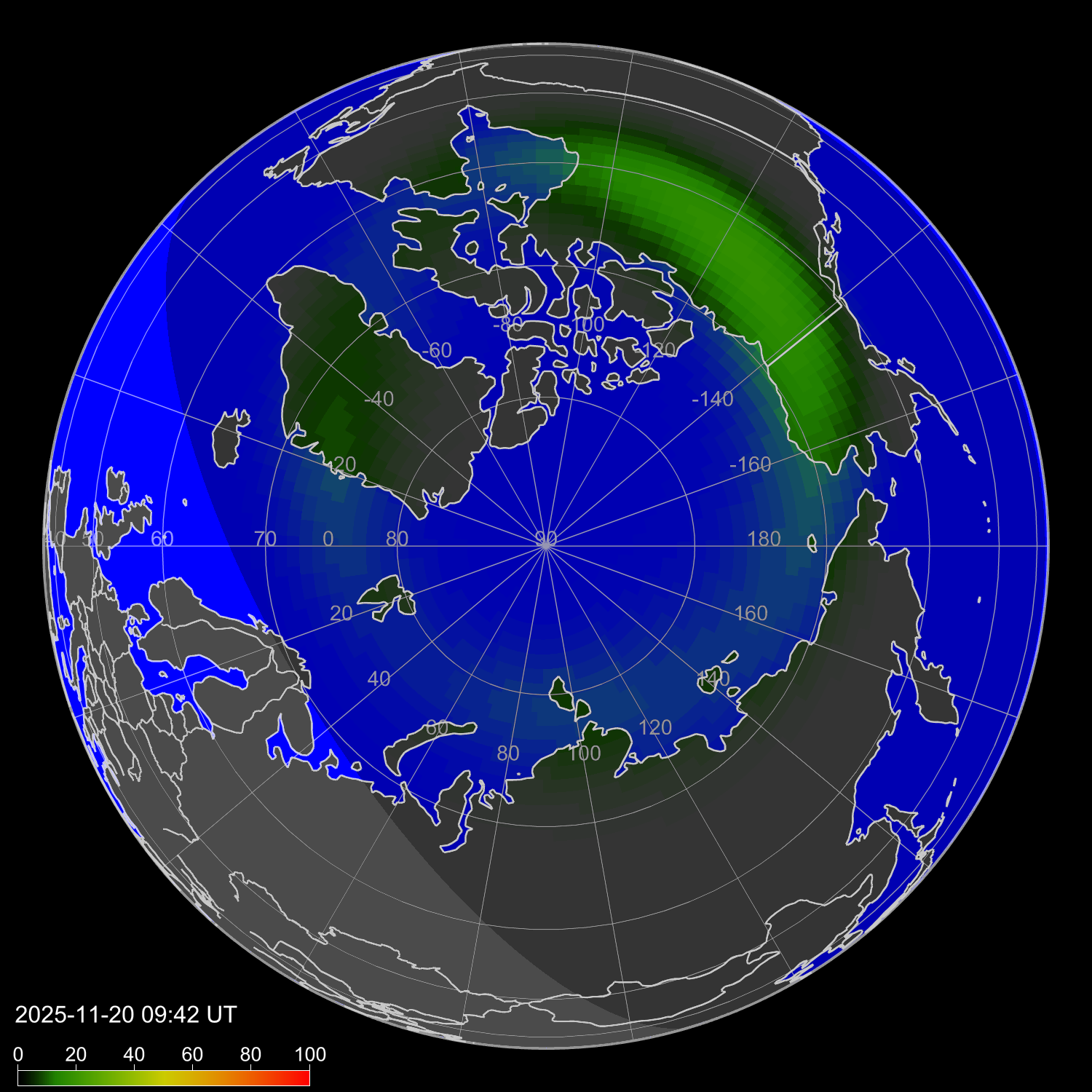 Индекс интенсивности полярных сияний и теоретически возможная широта наблюдений для ночного времени в западном полушарии