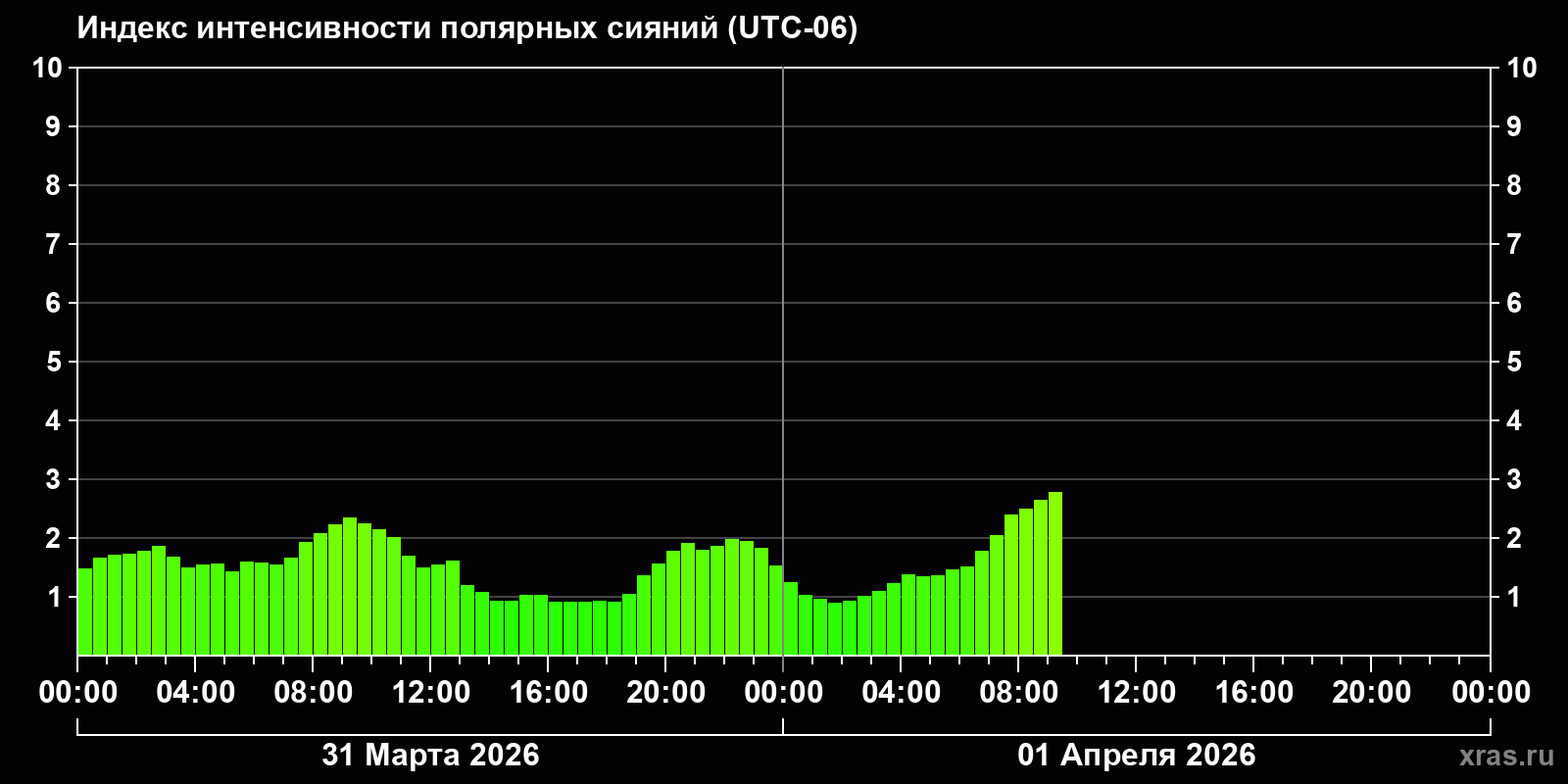 Изменения индекса интенсивности полярных сияний с 2026-03-31 по 2026-04-01 по местному времени