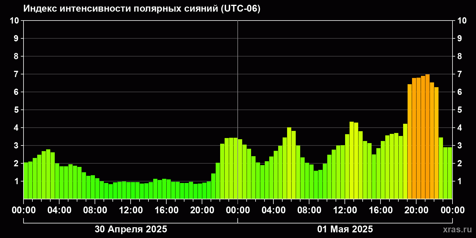 Изменения индекса интенсивности полярных сияний с 2025-04-30 по 2025-05-01 по местному времени