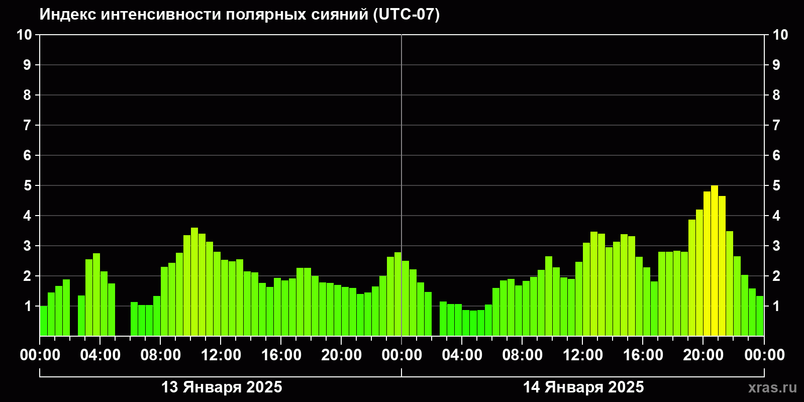 Изменения индекса интенсивности полярных сияний с 2025-01-13 по 2025-01-14 по местному времени