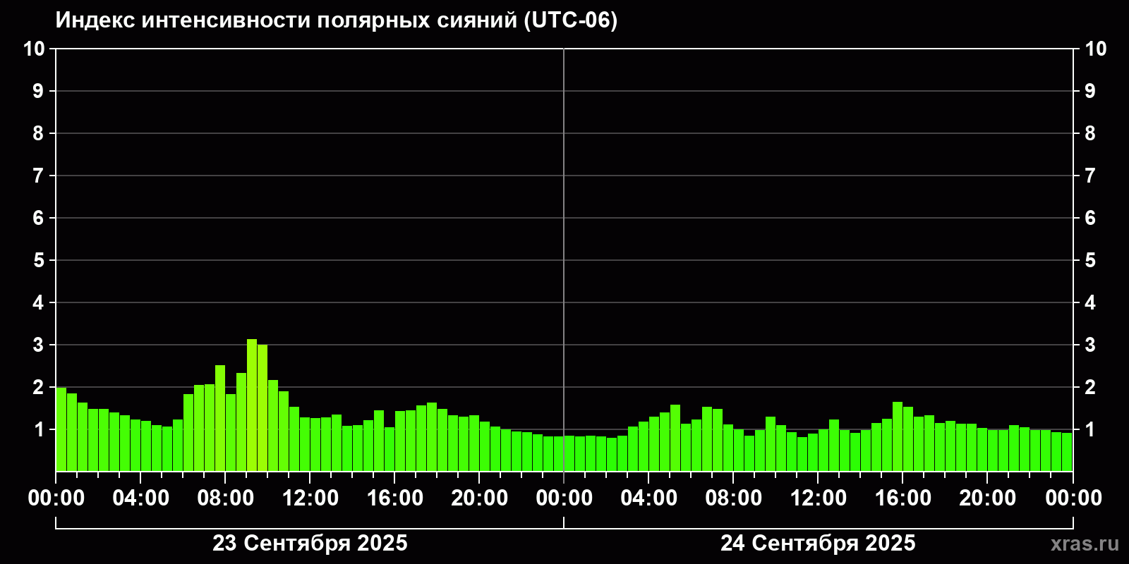 Изменения индекса интенсивности полярных сияний с 2025-09-23 по 2025-09-24 по местному времени