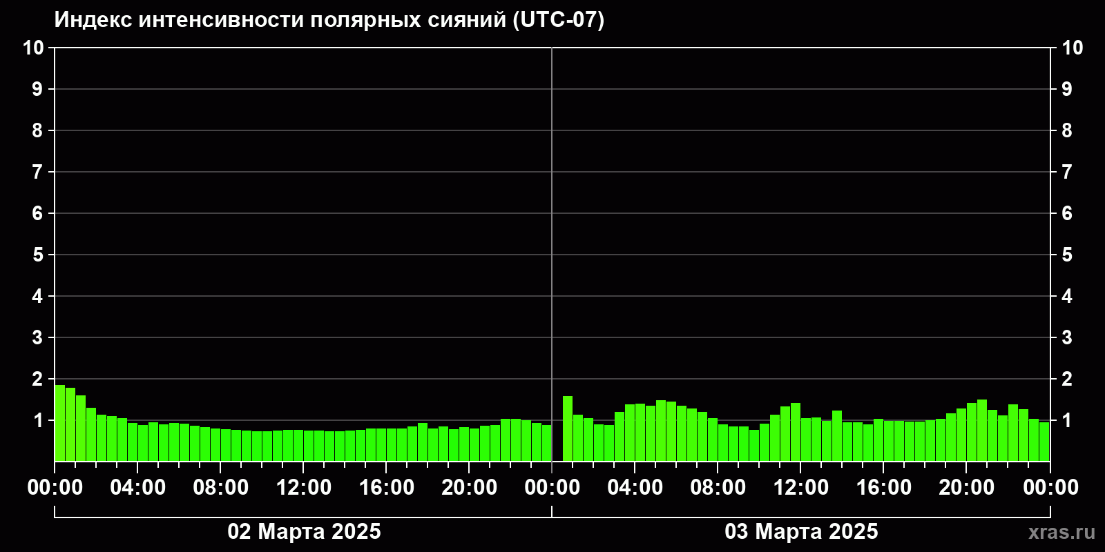 Изменения индекса интенсивности полярных сияний с 2025-03-02 по 2025-03-03 по местному времени
