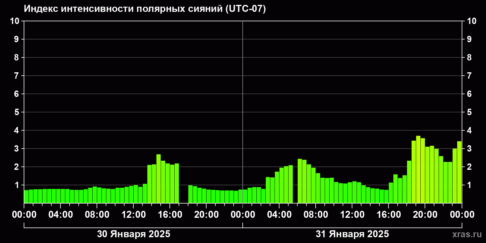 Изменения индекса интенсивности полярных сияний с 2025-01-30 по 2025-01-31 по местному времени