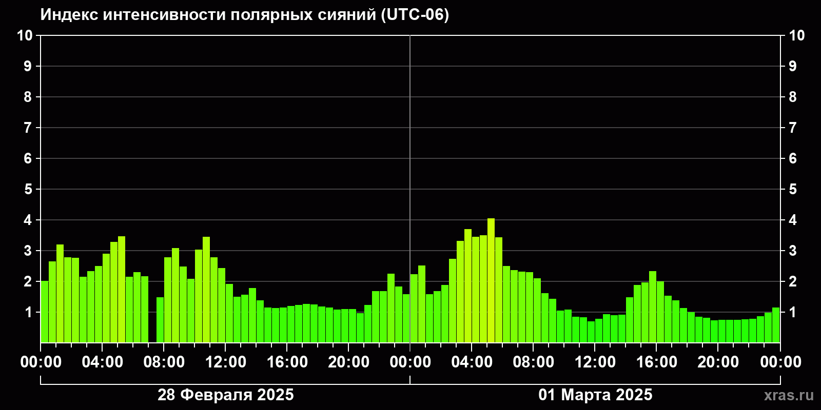 Изменения индекса интенсивности полярных сияний с 2025-02-28 по 2025-03-01 по местному времени