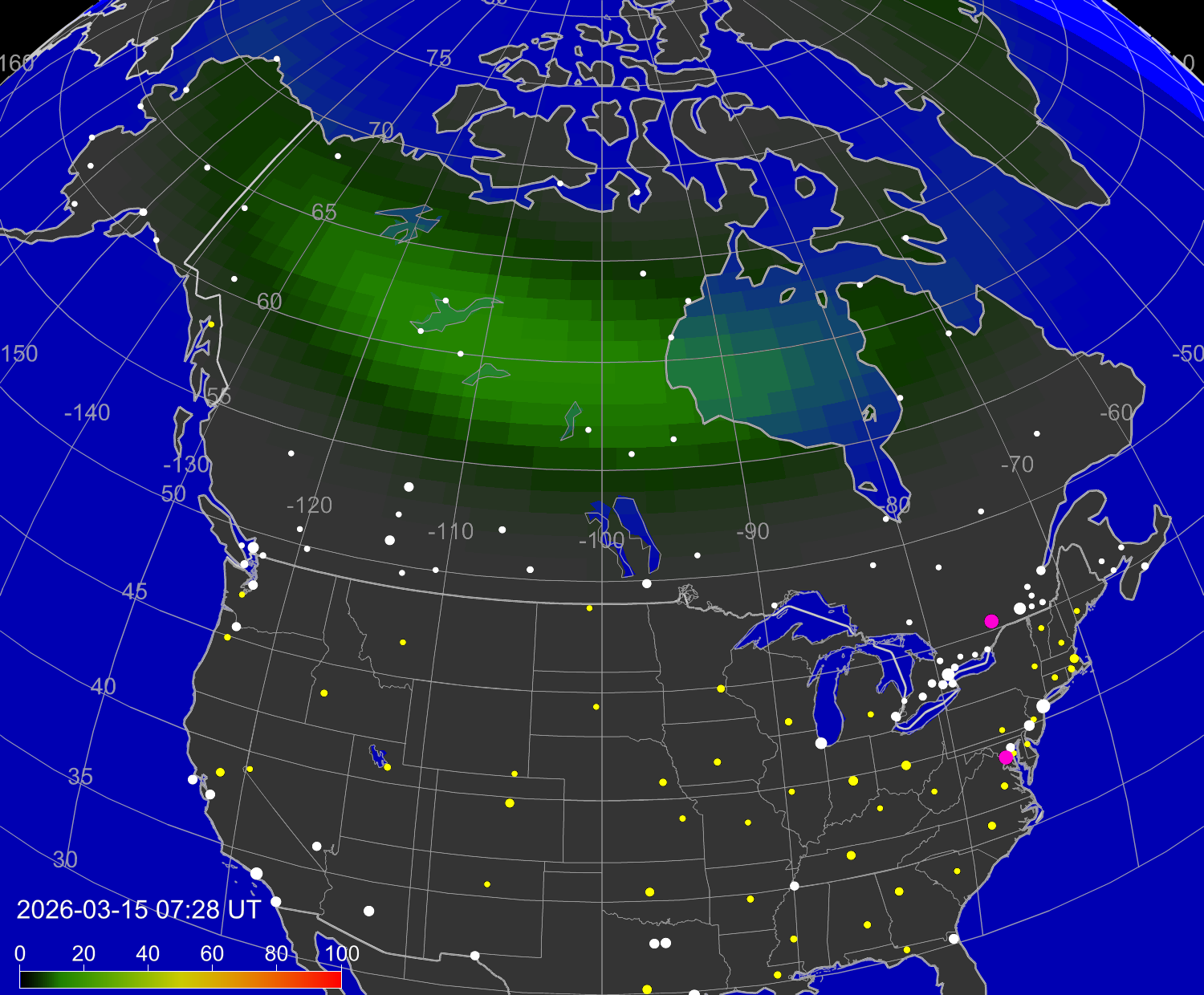 Зона полярных (северных) сияний над территорией Северной Америки