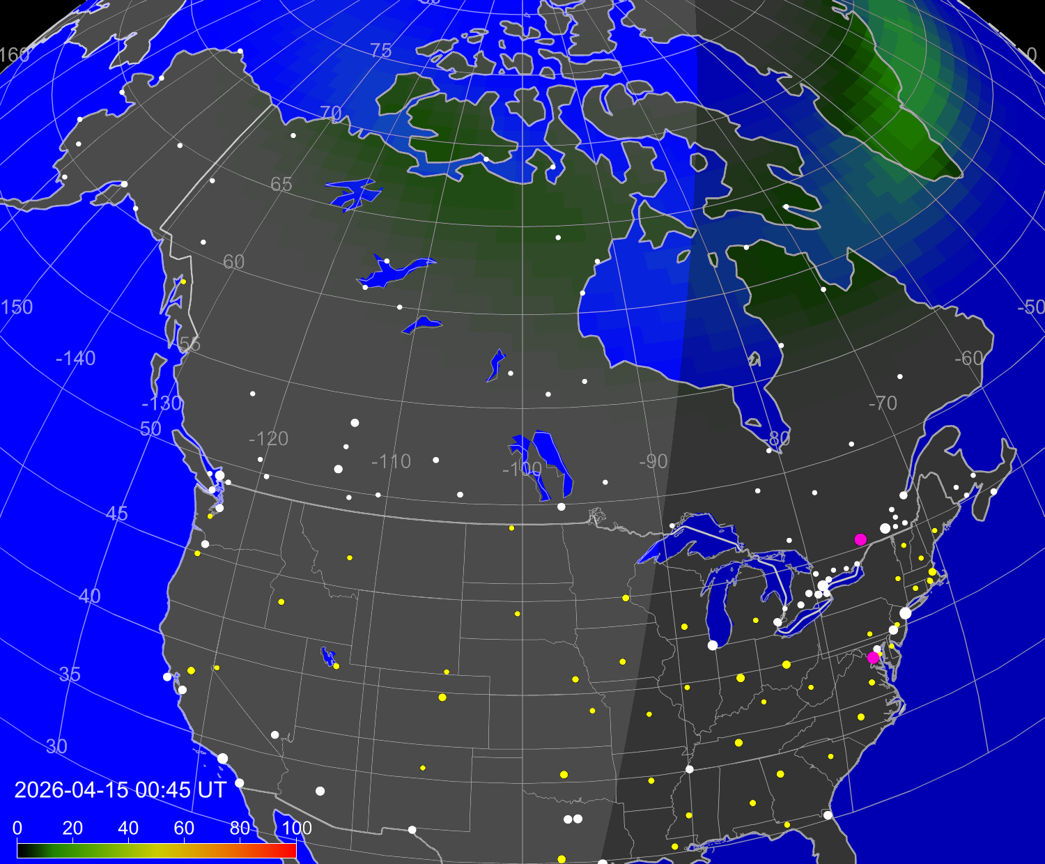 Индекс интенсивности полярных сияний и теоретически возможная широта наблюдений для ночного времени в западном полушарии