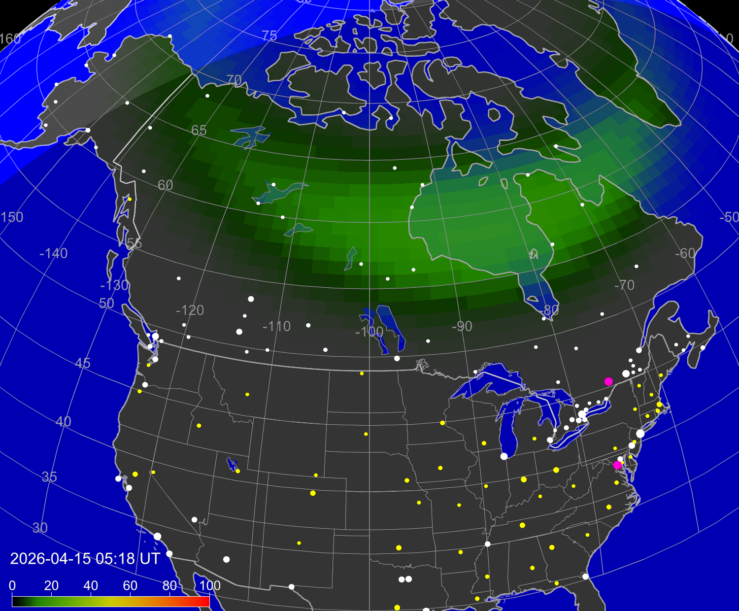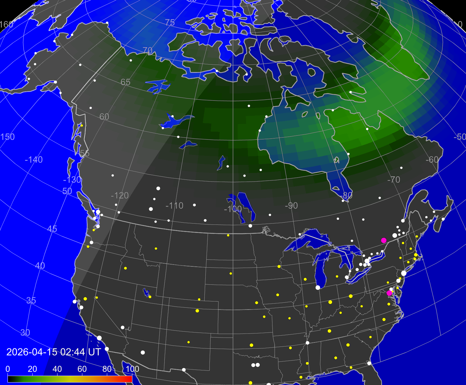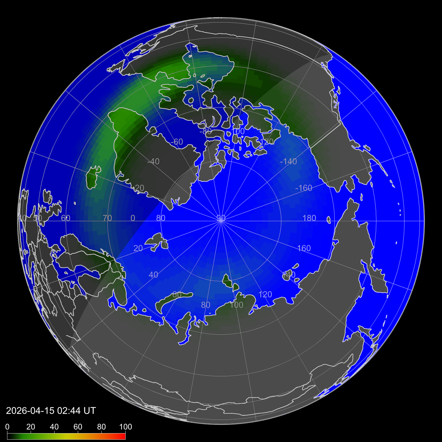 Индекс интенсивности полярных сияний и теоретически возможная широта наблюдений для ночного времени в западном полушарии