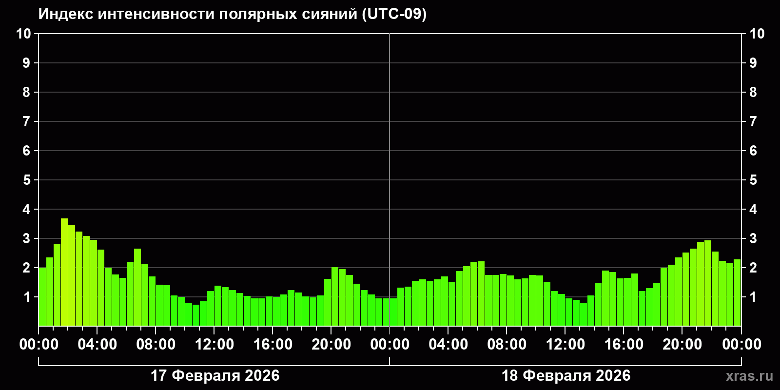 Изменения индекса интенсивности полярных сияний с 2026-02-17 по 2026-02-18 по местному времени