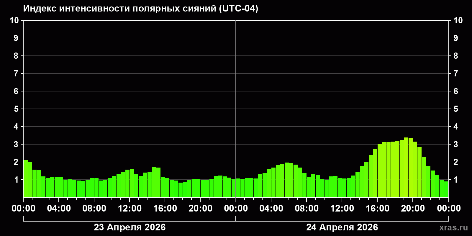 Изменения индекса интенсивности полярных сияний с 2026-04-23 по 2026-04-24 по местному времени