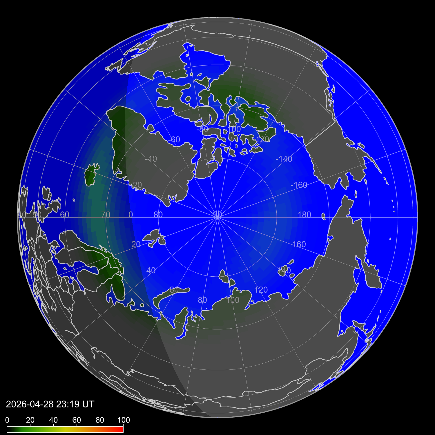 Индекс интенсивности полярных сияний и теоретически возможная широта наблюдений для ночного времени в западном полушарии