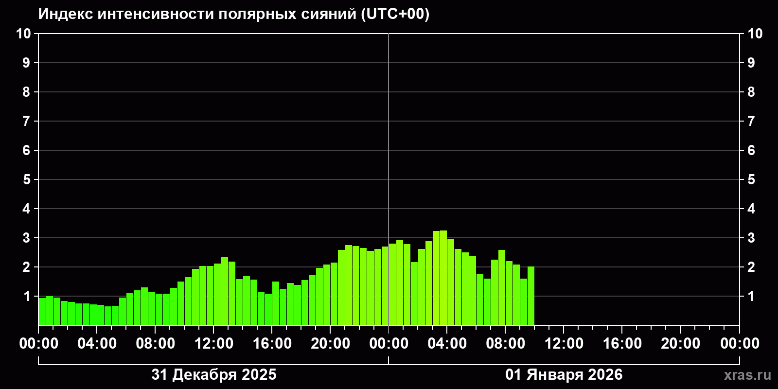Изменения индекса интенсивности полярных сияний с 2025-12-31 по 2026-01-01 по местному времени