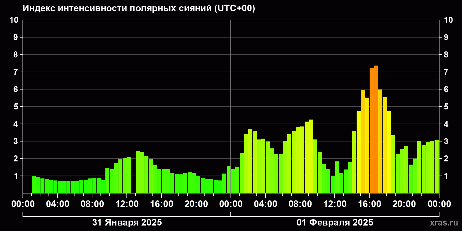 Изменения индекса интенсивности полярных сияний с 2025-01-31 по 2025-02-01 по местному времени