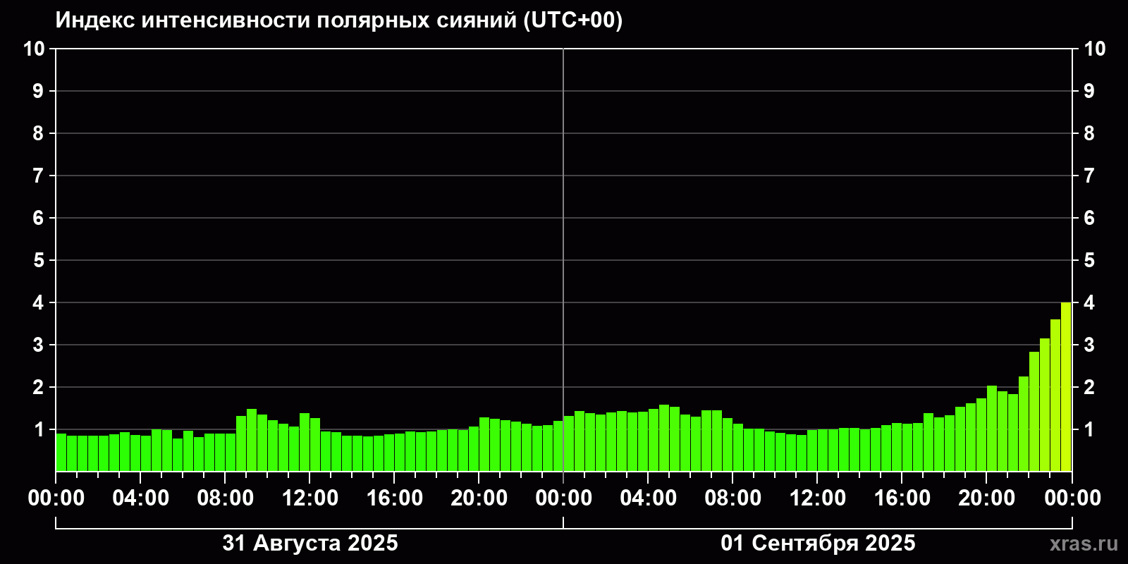 Изменения индекса интенсивности полярных сияний с 2025-08-31 по 2025-09-01 по местному времени