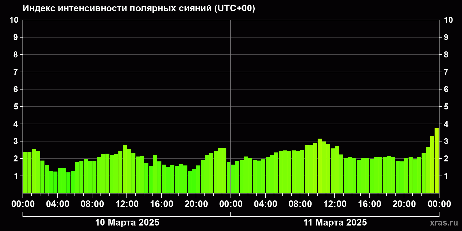 Изменения индекса интенсивности полярных сияний с 2025-03-10 по 2025-03-11 по местному времени