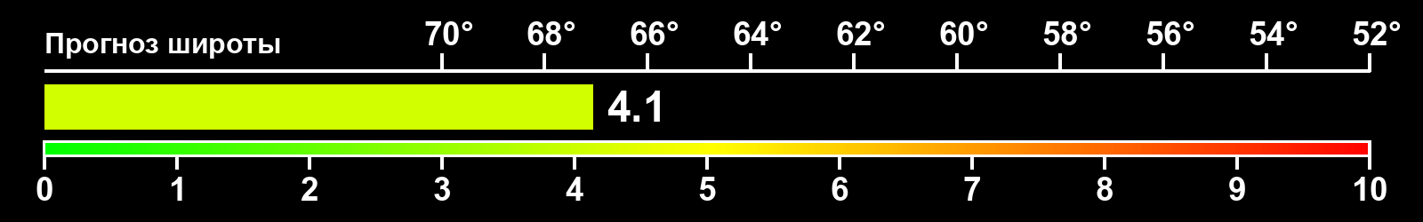 Индекс интенсивности полярных сияний и теоретически возможная широта наблюдений для ночного времени в восточном полушарии по состоянию на 2026-02-13 23:49 (конец дня) по местному времени