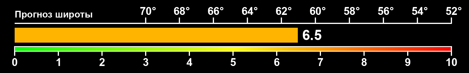Индекс интенсивности полярных сияний и теоретически возможная широта наблюдений для ночного времени в восточном полушарии по состоянию на 2025-06-13 23:59 (конец дня) по местному времени