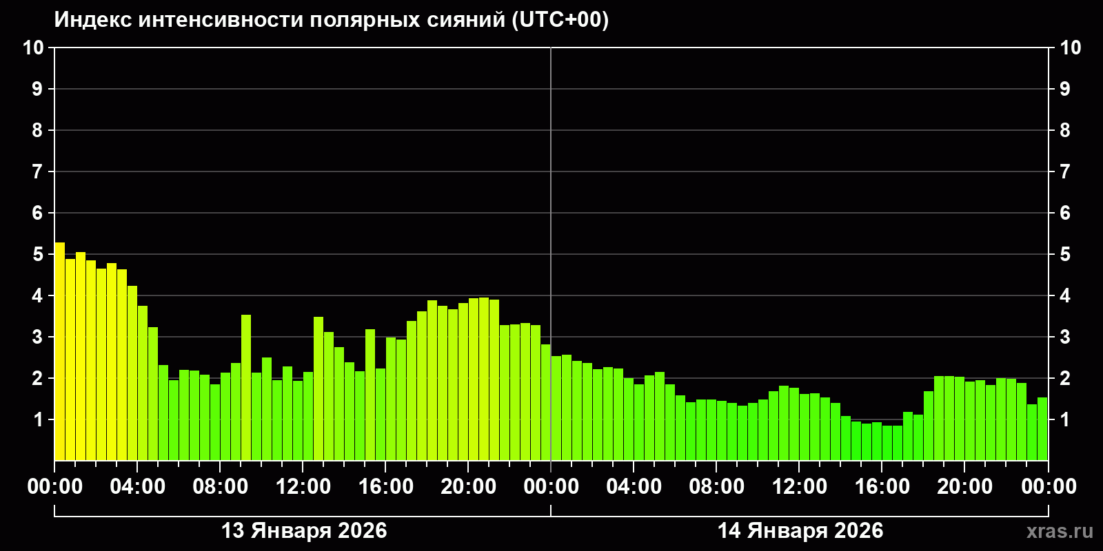 Изменения индекса интенсивности полярных сияний с 2026-01-13 по 2026-01-14 по местному времени