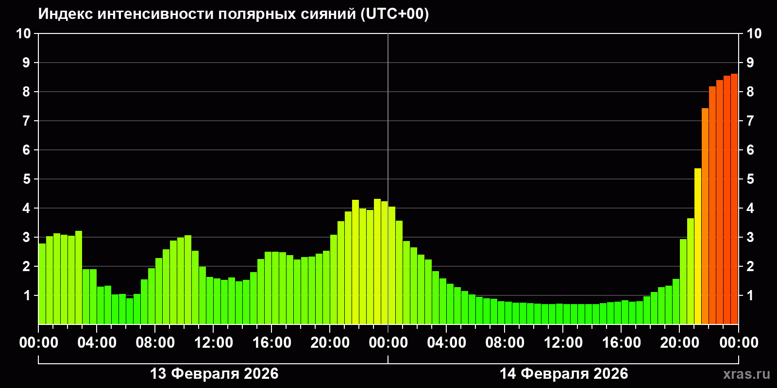 Изменения индекса интенсивности полярных сияний с 2026-02-13 по 2026-02-14 по местному времени