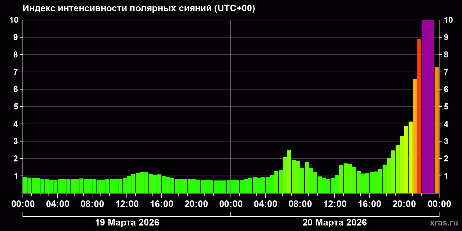 Изменения индекса интенсивности полярных сияний с 2026-03-19 по 2026-03-20 по местному времени