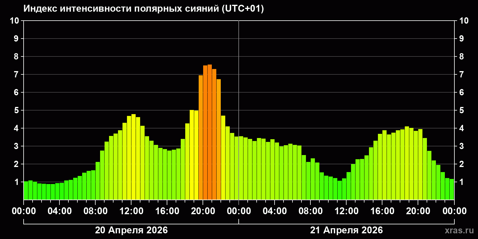 Изменения индекса интенсивности полярных сияний с 2026-04-20 по 2026-04-21 по местному времени