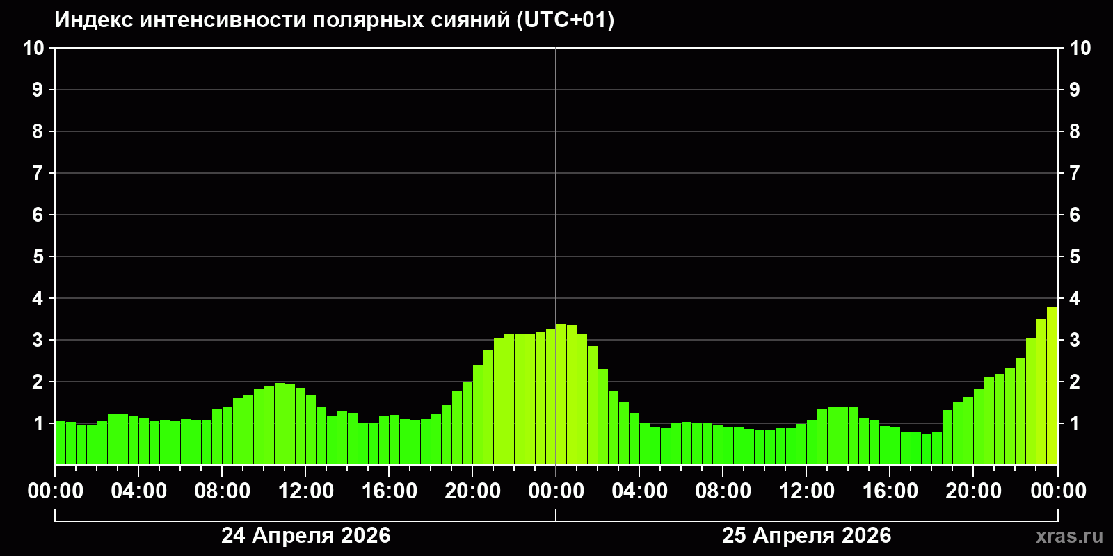 Изменения индекса интенсивности полярных сияний с 2026-04-24 по 2026-04-25 по местному времени