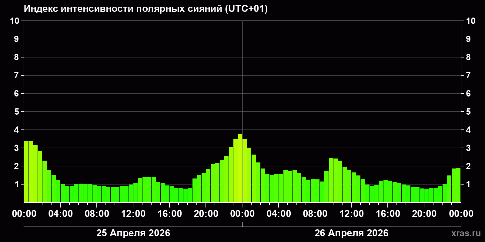 Изменения индекса интенсивности полярных сияний с 2026-04-25 по 2026-04-26 по местному времени