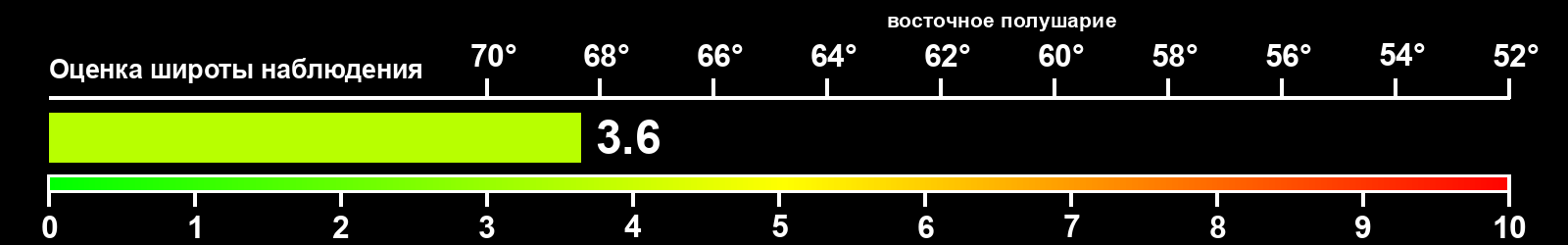 Индекс интенсивности полярных сияний и теоретически возможная широта наблюдений для ночного времени в восточном полушарии по состоянию на 2025-09-30 23:45 (конец дня) по местному времени