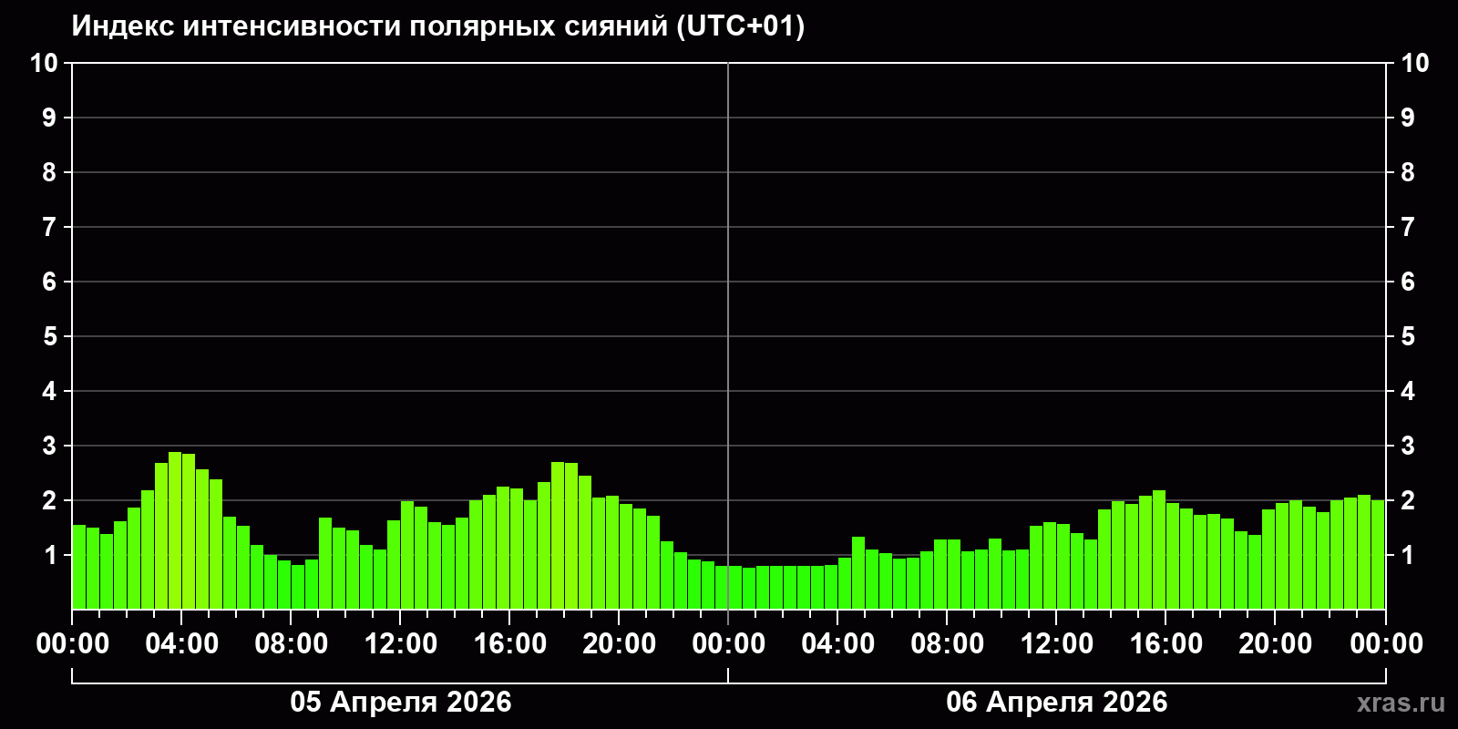 Изменения индекса интенсивности полярных сияний с 2026-04-05 по 2026-04-06 по местному времени