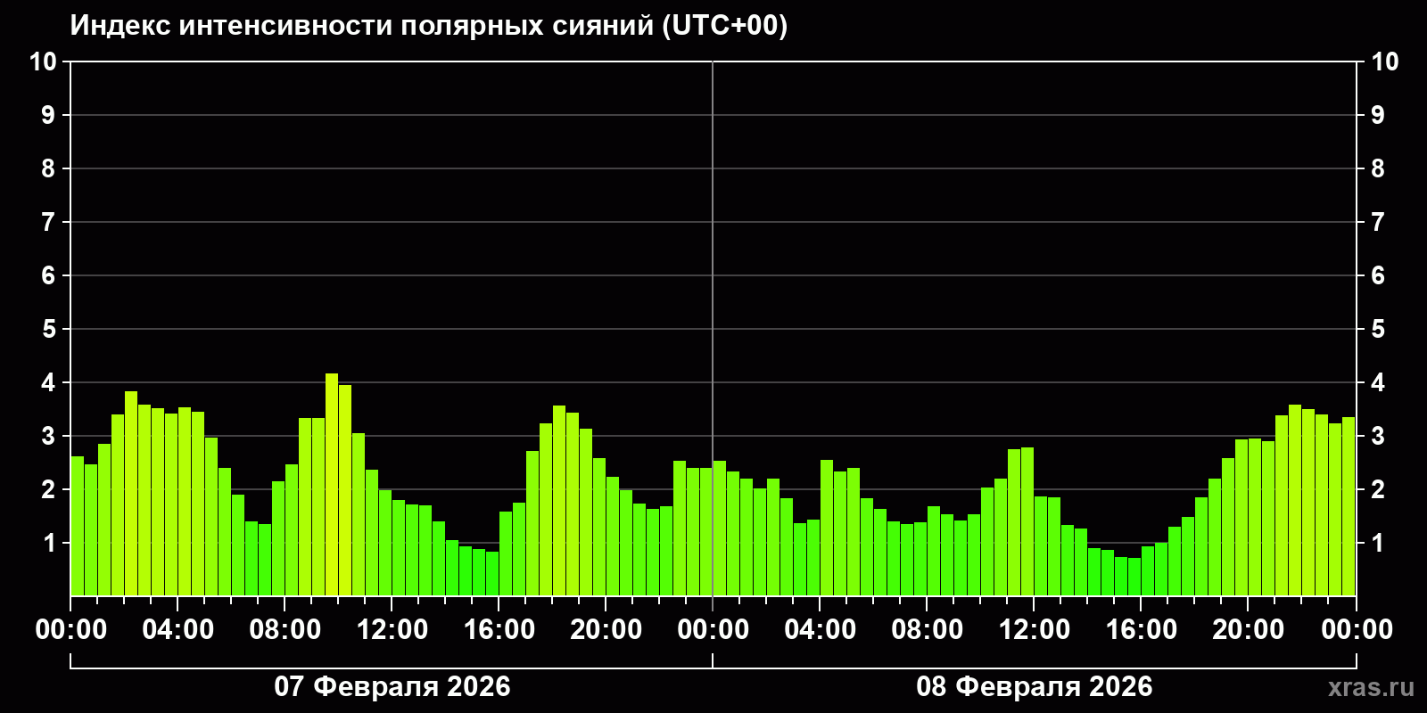 Изменения индекса интенсивности полярных сияний с 2026-02-07 по 2026-02-08 по местному времени