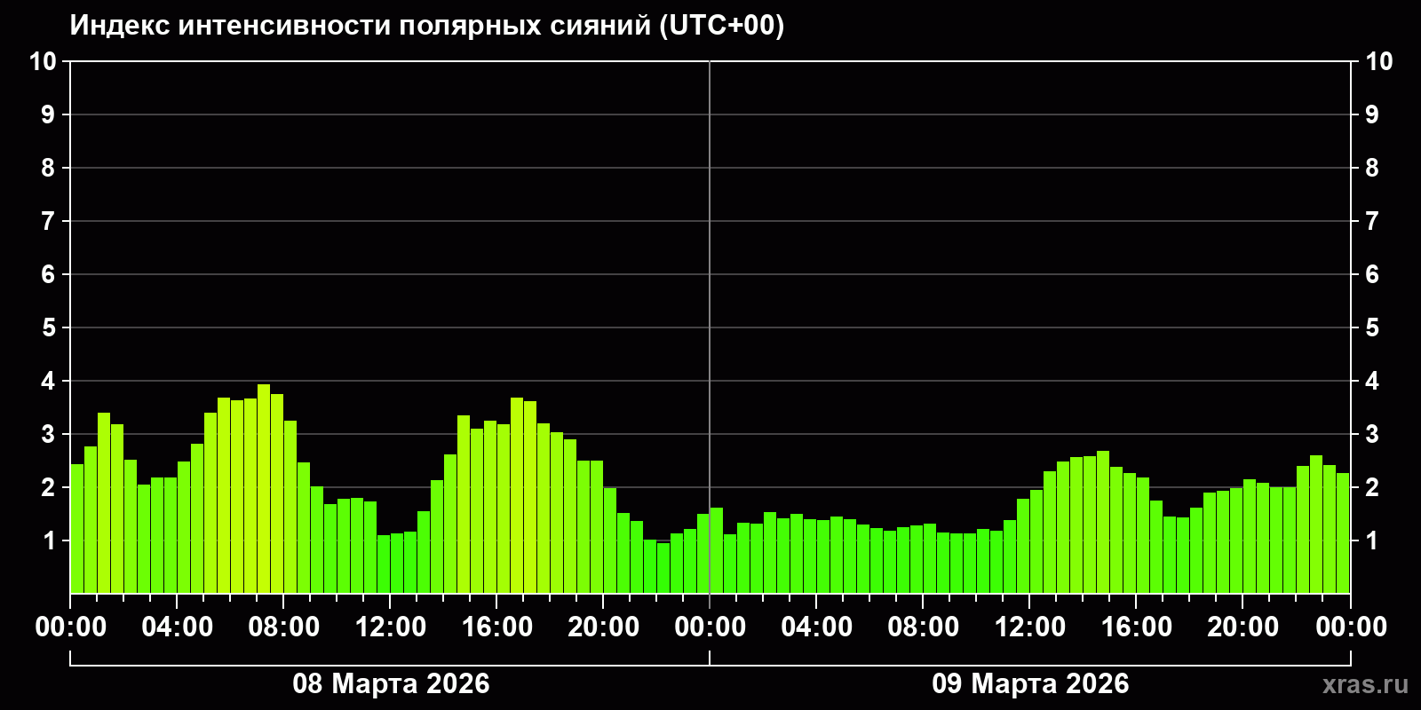 Изменения индекса интенсивности полярных сияний с 2026-03-08 по 2026-03-09 по местному времени