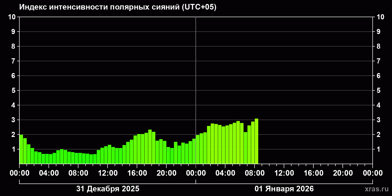 Изменения индекса интенсивности полярных сияний с 2025-12-31 по 2026-01-01 по местному времени