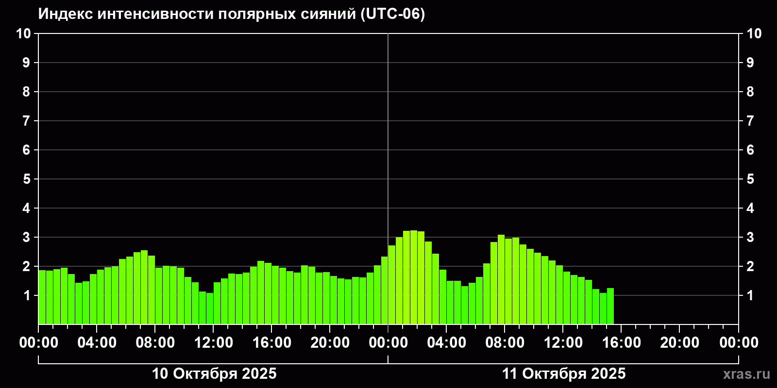 Изменения индекса интенсивности полярных сияний с 2025-10-10 по 2025-10-11 по местному времени