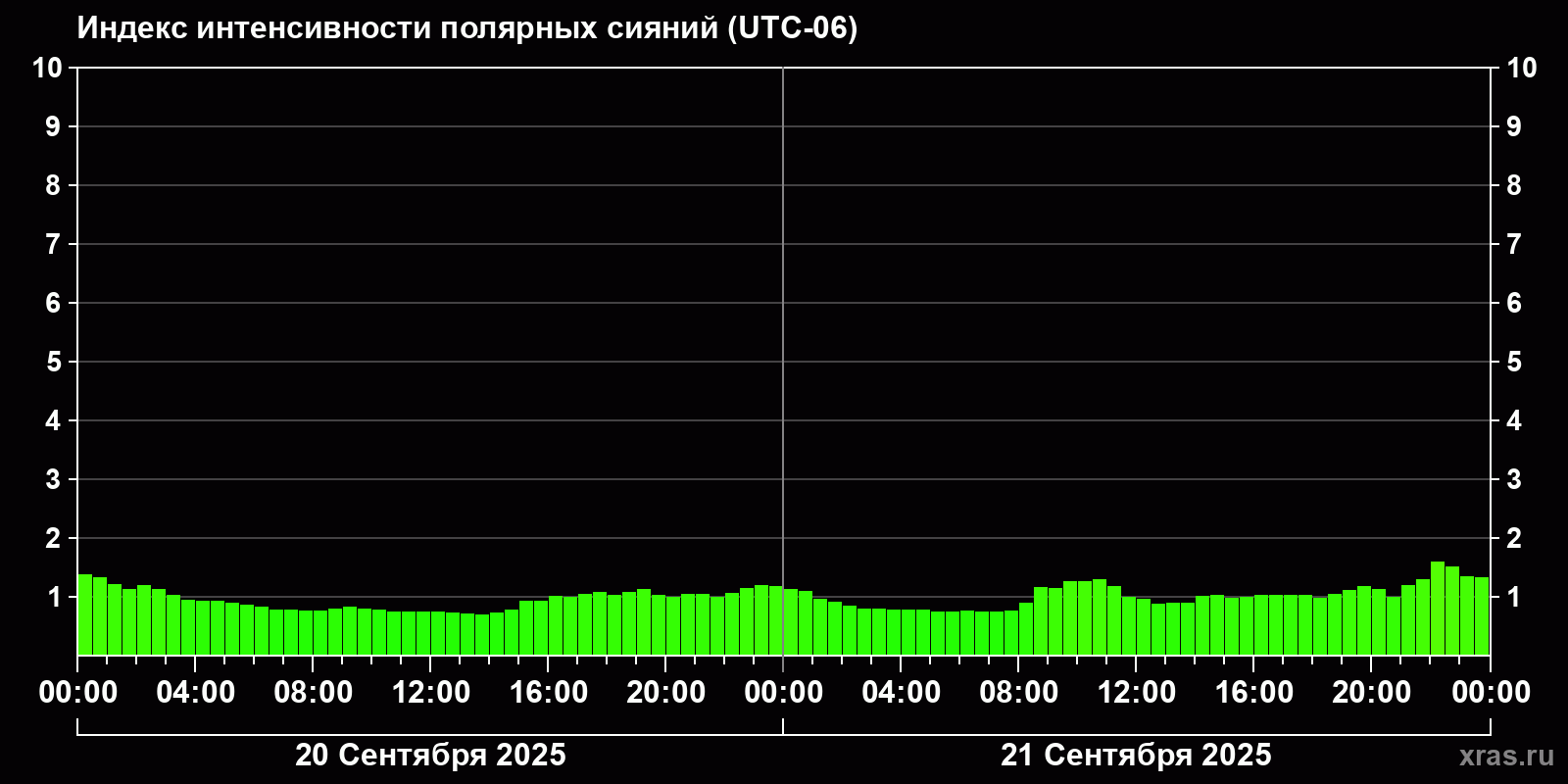 Изменения индекса интенсивности полярных сияний с 2025-09-20 по 2025-09-21 по местному времени
