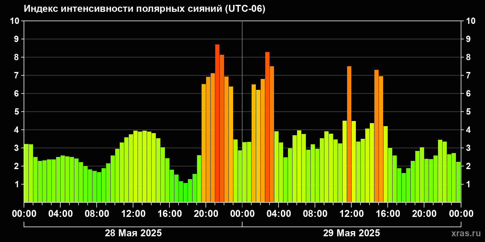 Изменения индекса интенсивности полярных сияний с 2025-05-28 по 2025-05-29 по местному времени
