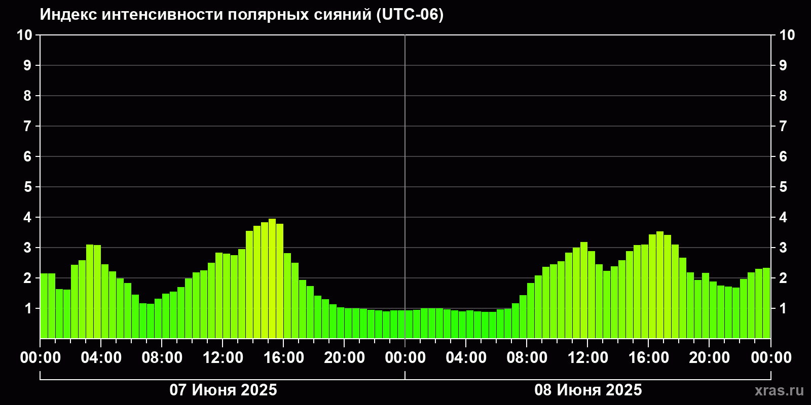 Изменения индекса интенсивности полярных сияний с 2025-06-07 по 2025-06-08 по местному времени