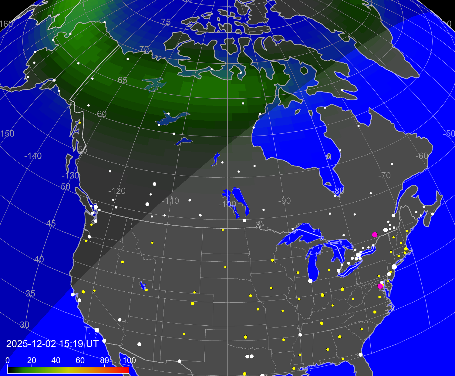 Изменения и часовой прогноз индекса интенсивности полярных сияний с 2025-11-30 по 2025-12-01