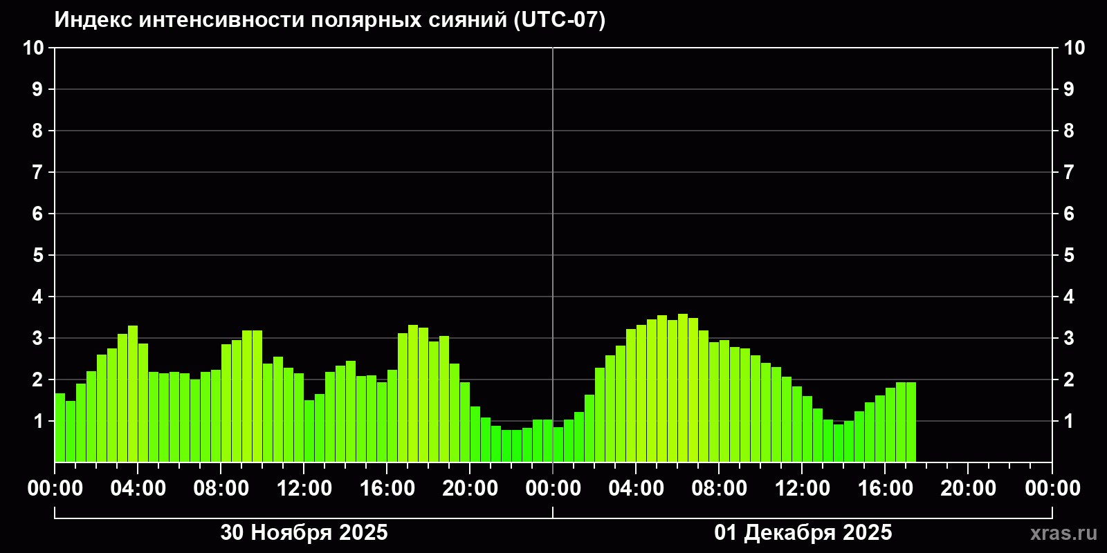 Изменения индекса интенсивности полярных сияний с 2025-11-30 по 2025-12-01 по местному времени