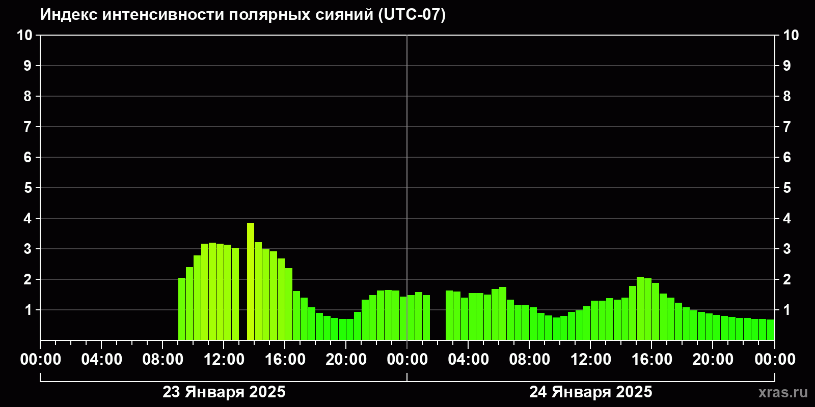 Изменения индекса интенсивности полярных сияний с 2025-01-23 по 2025-01-24 по местному времени
