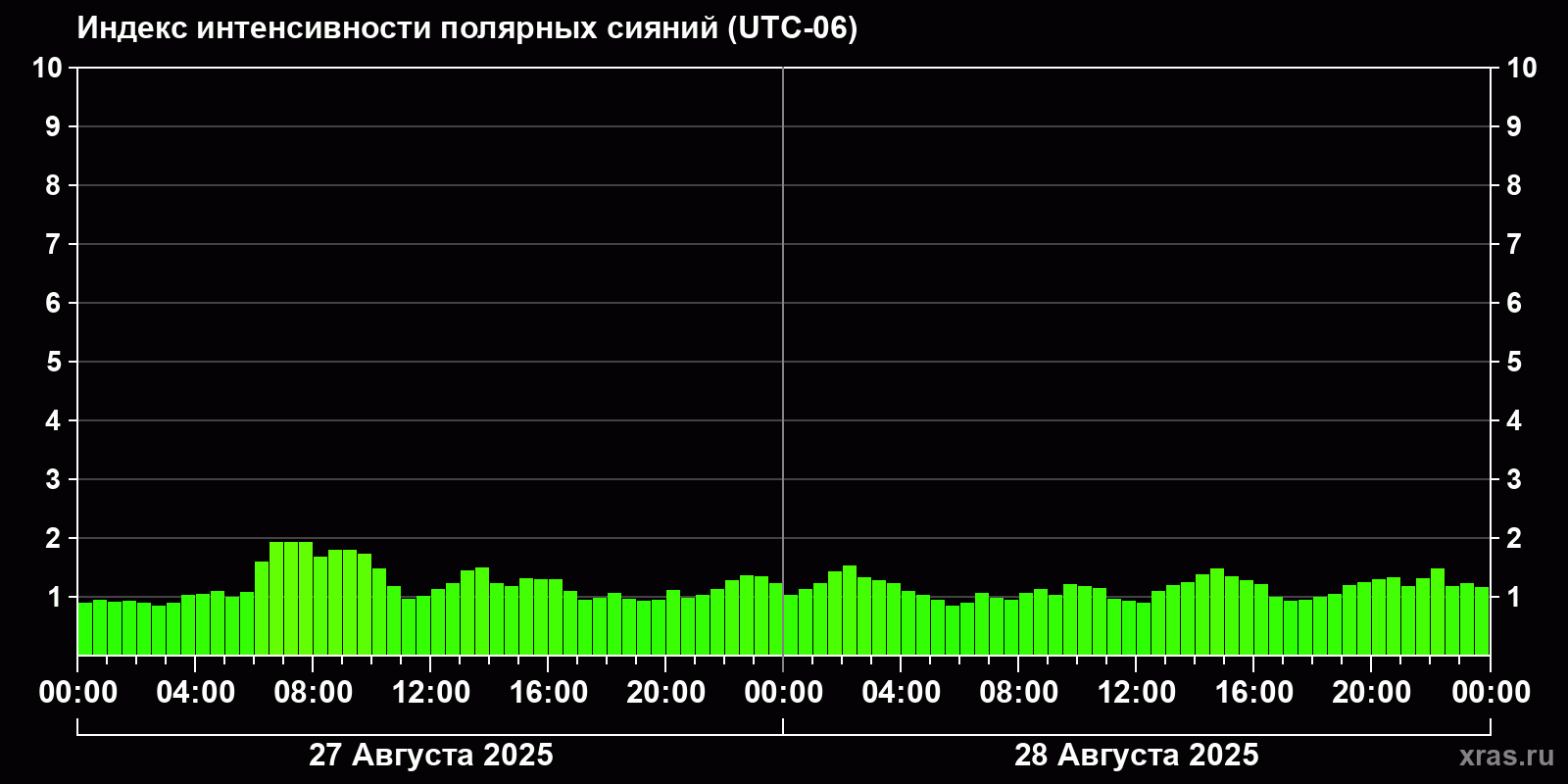 Изменения индекса интенсивности полярных сияний с 2025-08-27 по 2025-08-28 по местному времени