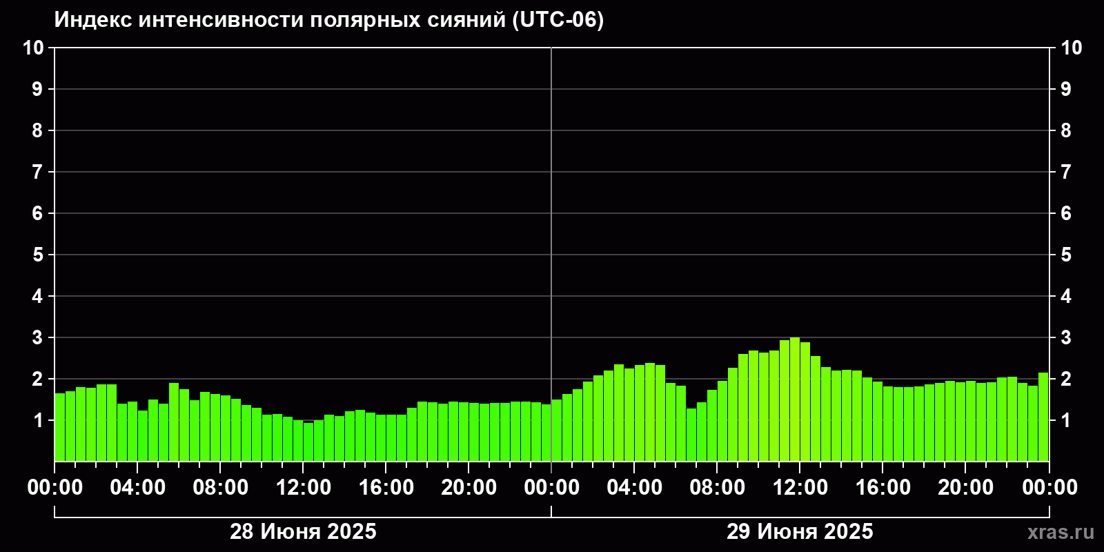 Изменения индекса интенсивности полярных сияний с 2025-06-28 по 2025-06-29 по местному времени