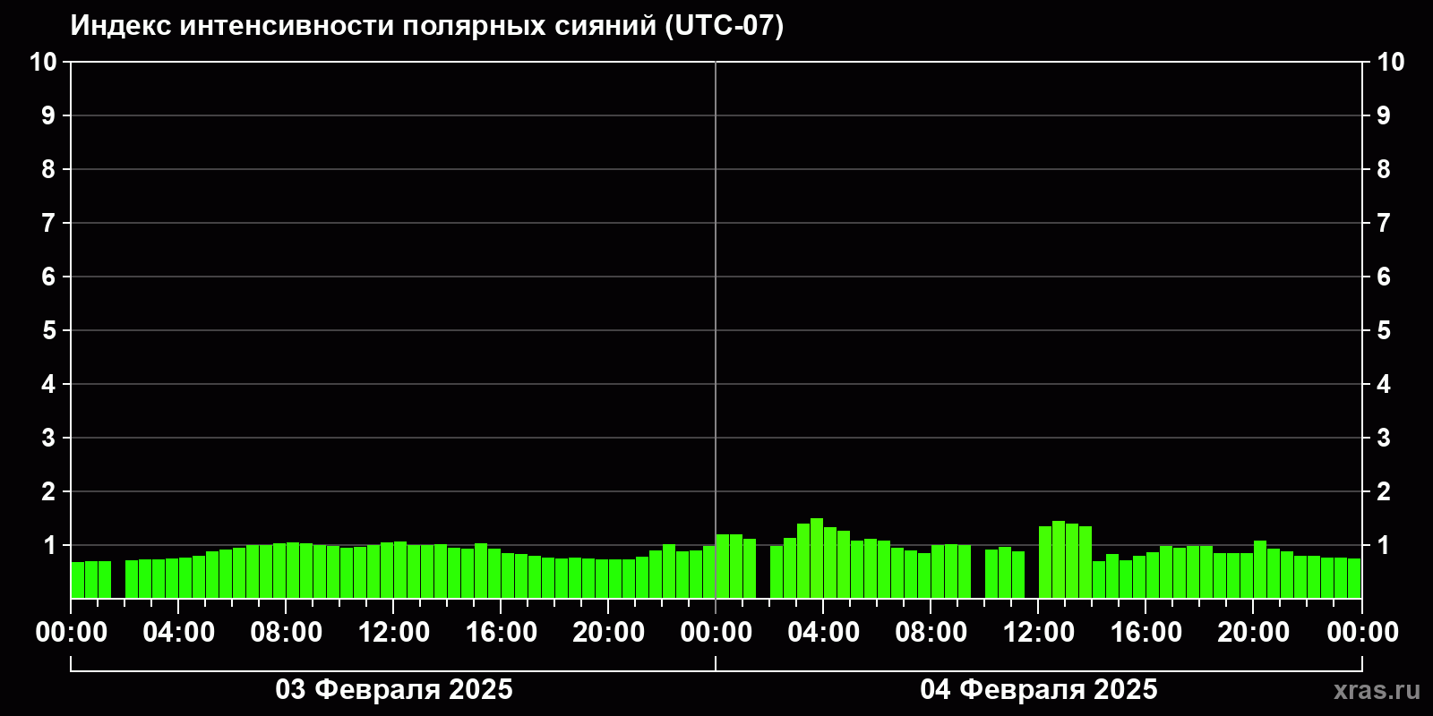 Изменения индекса интенсивности полярных сияний с 2025-02-03 по 2025-02-04 по местному времени