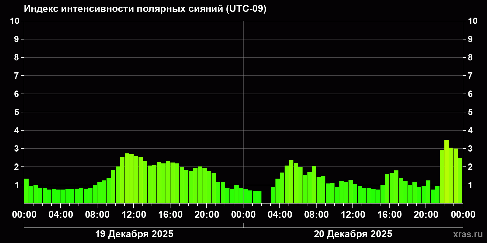 Изменения индекса интенсивности полярных сияний с 2025-12-19 по 2025-12-20 по местному времени
