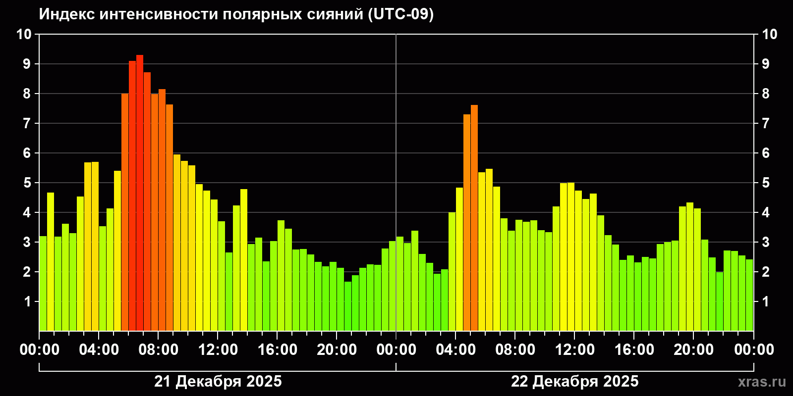 Изменения индекса интенсивности полярных сияний с 2025-12-21 по 2025-12-22 по местному времени